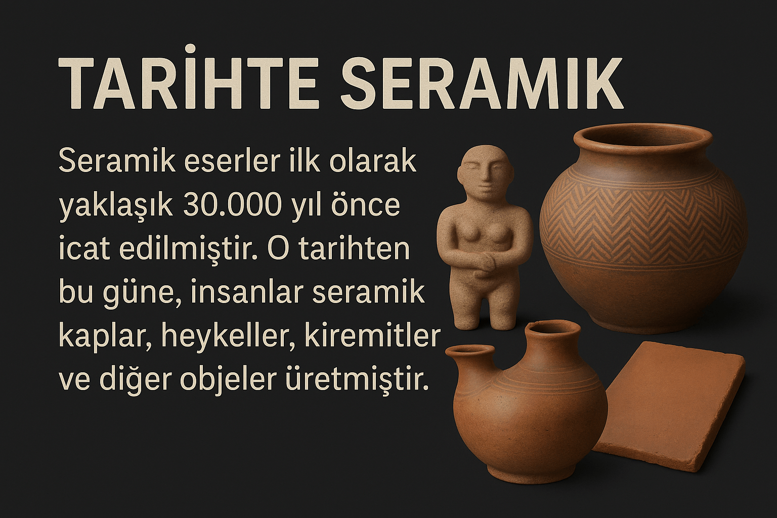 Seramik, insanlık tarihinin en eski sanat ve zanaat dallarından biridir. İlk seramik eserler, yaklaşık M.Ö. 10.000 yılına dayanan Neolitik dönemde ortaya çıktı. Bu dönemde insanlar toprağı suyla karıştırarak şekillendirmeyi, ardından da güneşte kurutarak ya da ilkel fırınlarda pişirerek dayanıklı kaplar üretmeyi keşfettiler. Bu kaplar, genellikle yiyecek ve su depolamak amacıyla kullanılıyordu.